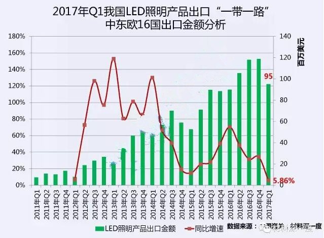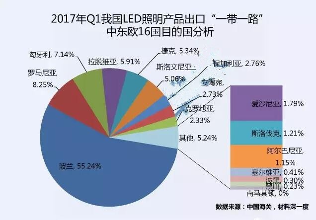 ? 據(jù)統(tǒng)計(jì),2017年一季度我國(guó)LED照明產(chǎn)品出口中東歐16個(gè)國(guó)家的總金額達(dá)9508萬(wàn)美元,同比增加5.86%