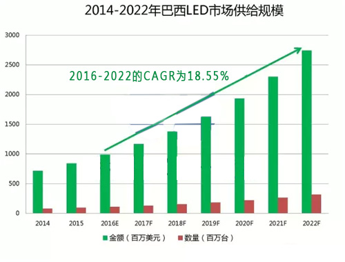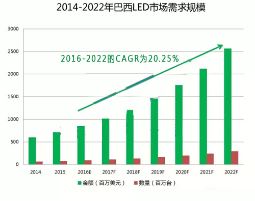 ? 得益于巴西政府和地方政府對LED照明產品的推廣,據TechSci Research統計,2016年巴西LED市場需求規模為8.48億美元,預計2022年將增長至25.62億美元,實現20.25%的年復合增長率。