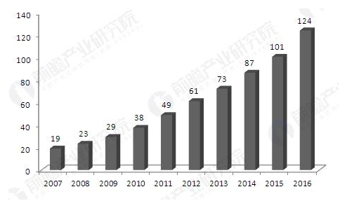 2007-2016年中國智能照明行業(yè)市場規(guī)模(單位:億元)