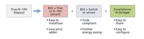 ? 下面舉一些無縫智能照明的例子,決策者看到后,會減少相應阻力,并加速智能照明的廣泛采用,如圖3所示。在美國,LED照明廠商可以安裝可調光驅動器來改善LED照明或繼續使用傳統的調光器,比如三端雙向可控硅或0-10V。使用現有的LED照明系統,可以添加BLE調光器或BLE智能調光器,以此替代三端雙向可控硅/ 0-10V調光器,這使得智能手機在住宅空間中能更加靈活地使用遙控技術。